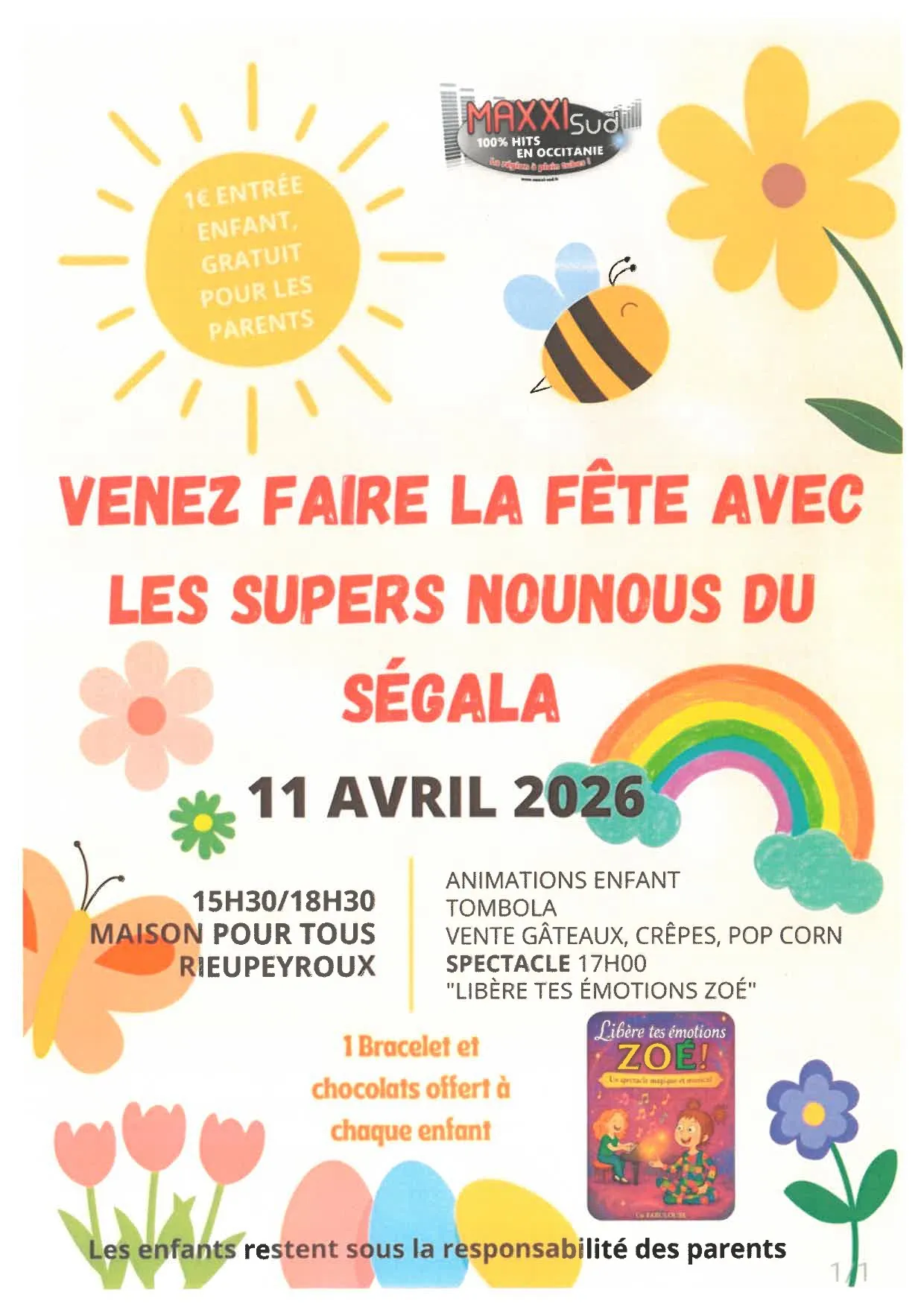 Venez faire la fête avec les supers nounous du Ségala !Animations enfant, tombola, vente gâteaux, crêpes, pop corn, spectacle à 17h « Libère tes émotions Zoé »