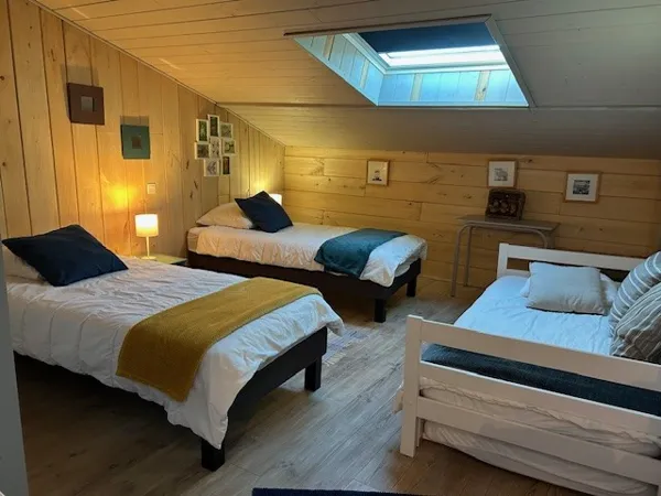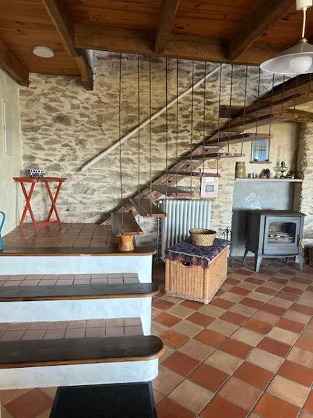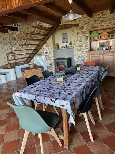 A l’étage, un grand salon avec télévision et un canapé convertible. Une grande chambre avec un grand lit et une autre avec 4 couchages, des toilettes. Chauffage poêle à bois et chaudière à granulés – location de draps.