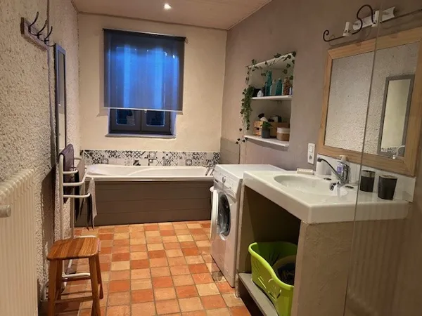 Au rez-de-chaussée, un grand séjour, cuisine tout confort, une salle de bain avec cabine de douche et baignoire, et un lave-linge. Une grande chambre avec un lit bébé, un grand lit, des toilettes séparées.